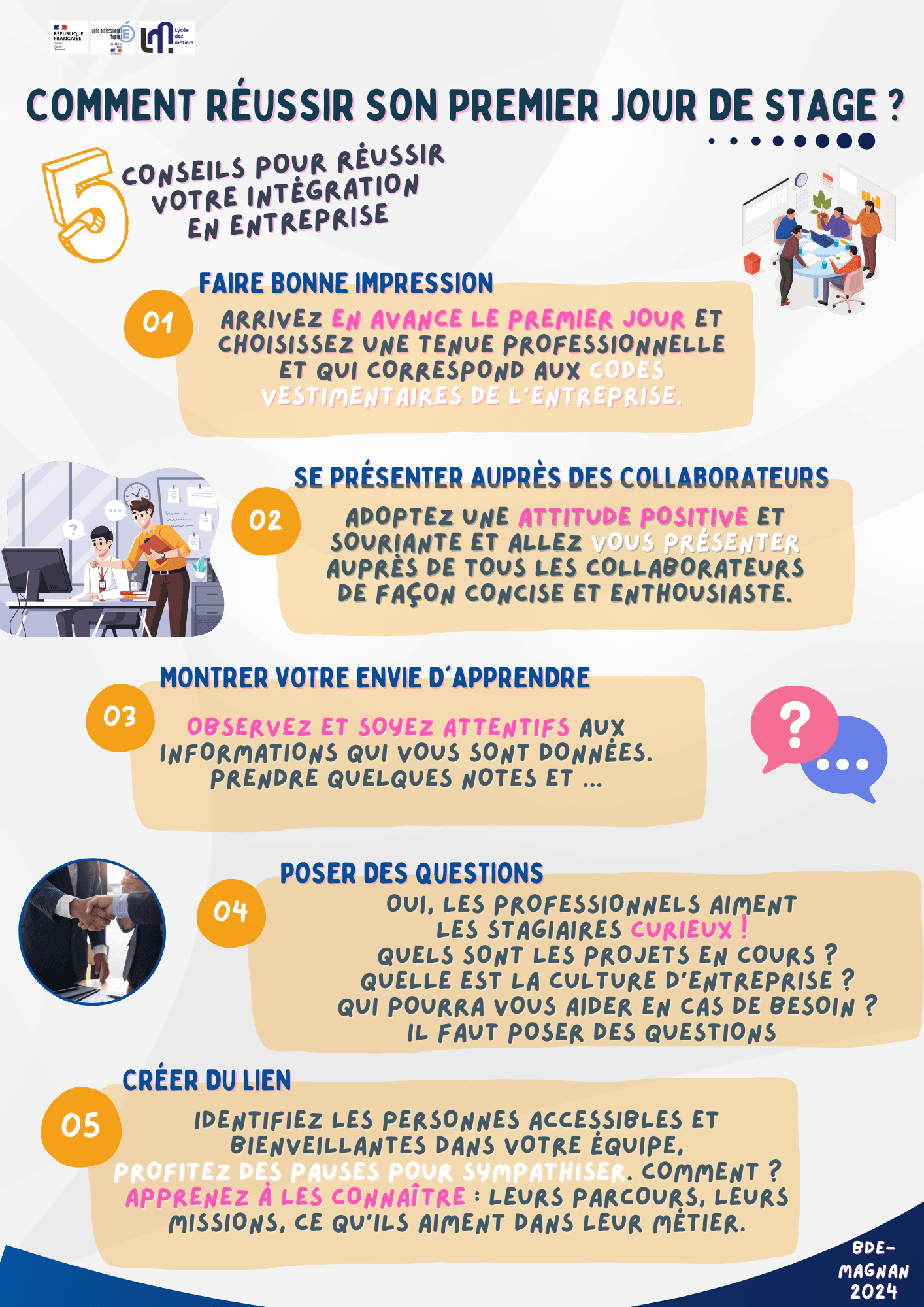 Arriver à l’heure, votre posture, votre tenue professionnelle, votre coiffure sont essentielles pour réussir au mieux votre stage.